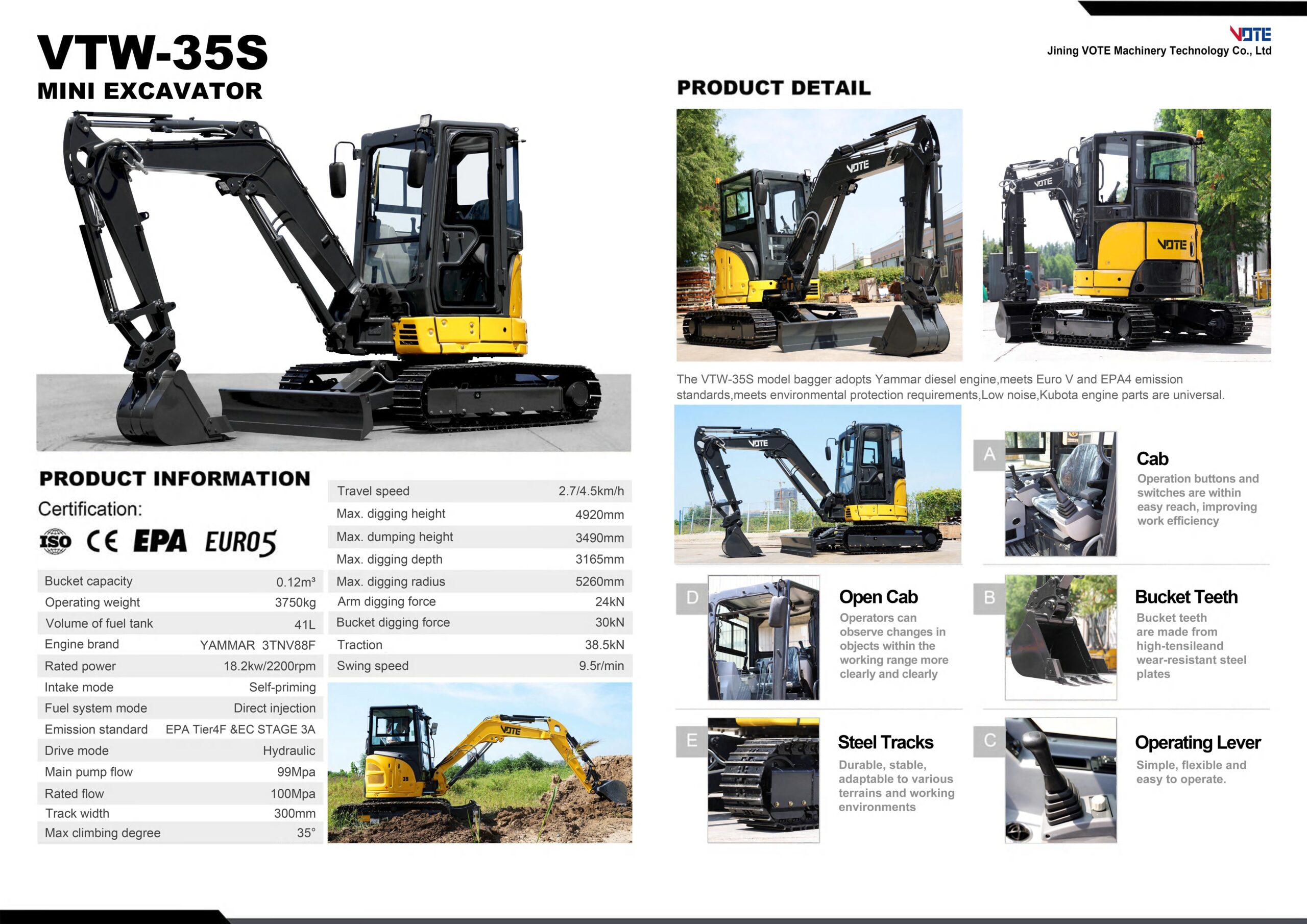 Con certificaciones ISO, CE, EPA y EURO 5, la VTW-35S se posiciona como una solución profesional de alto nivel, ideal para quienes buscan máxima capacidad, rendimiento y fiabilidad dentro del segmento de mini excavadoras.