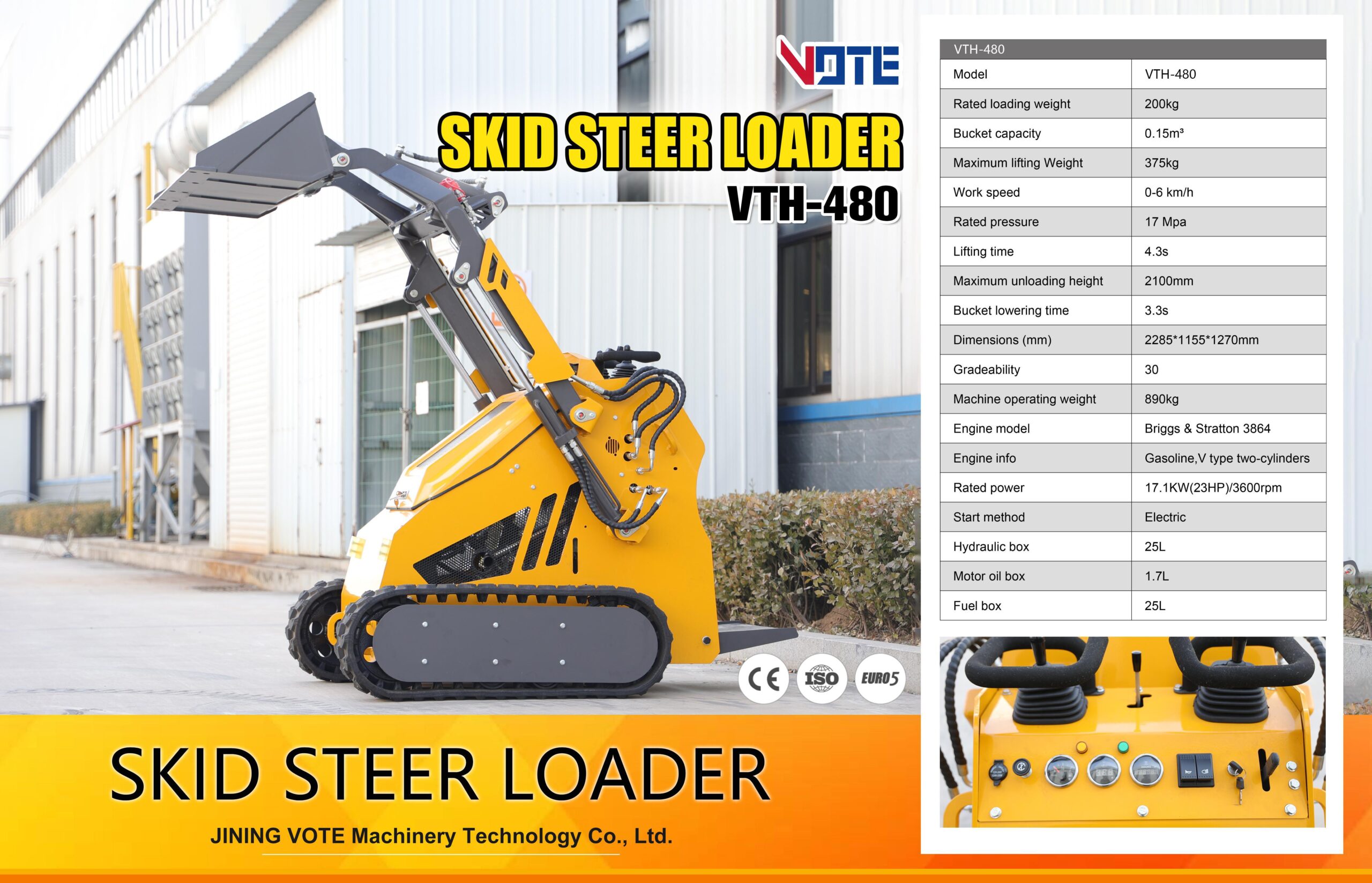 Certificada bajo normativas CE, ISO y EURO 5, la VTH-480 se posiciona como una solución eficiente dentro de su categoría, ideal para quienes buscan una máquina compacta con buen rendimiento, facilidad de uso y un comportamiento ágil en trabajos de carga y manipulación.
