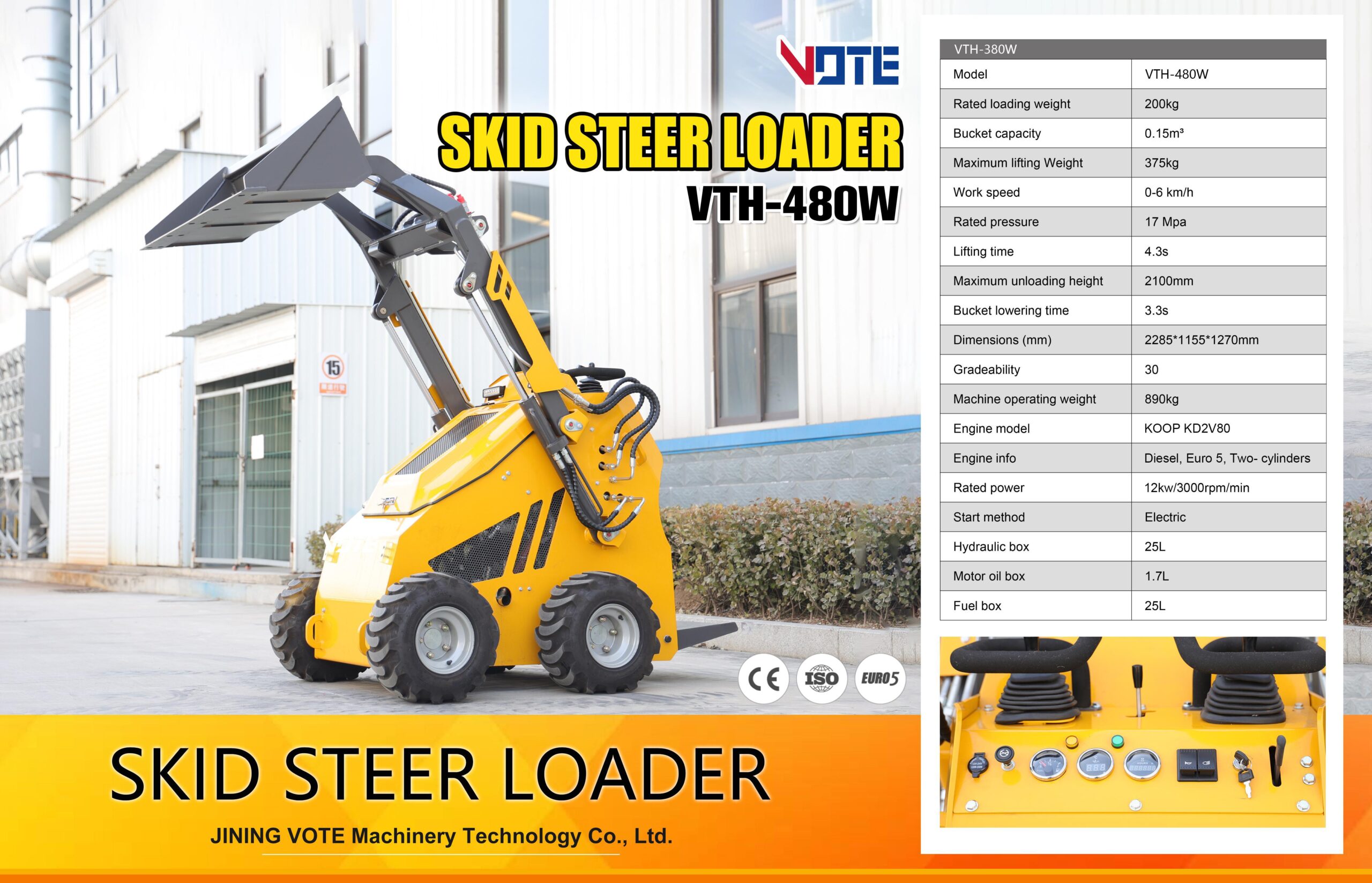 La VTH-480W es una skid steer loader compacta diseñada para ofrecer una mayor capacidad de carga, estabilidad y rendimiento en trabajos continuos, posicionándose como una opción más robusta dentro de la gama ligera.